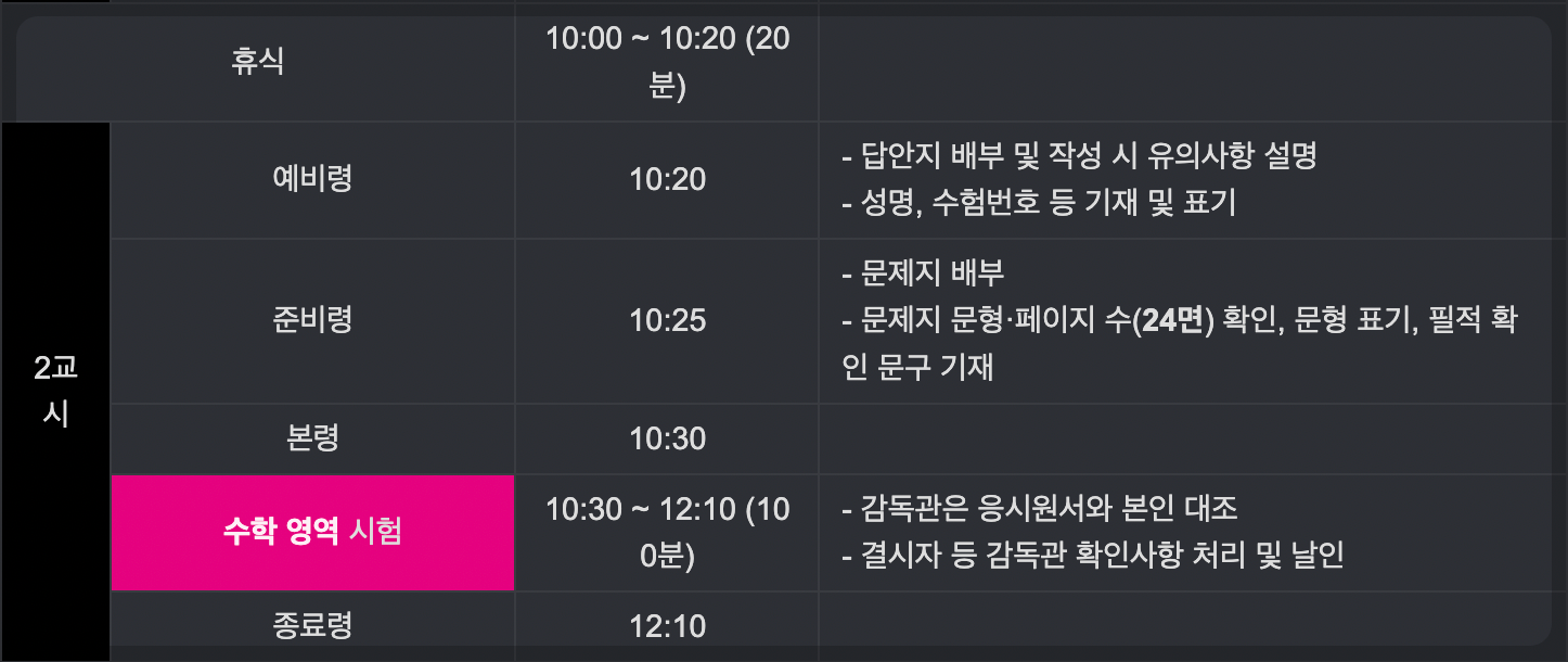 안녕하세요 여러분 오늘은 2024 수능과 관련된 주요 일정과 시간표, 준비자료, 주의사항에 대해 알아보겠습니다. 이틀뒤면 수능날이에요. 수험생들과 부모님들이 많이 긴장하셨을 것 같아요. 자세한 내용을 알아봅시다. 2024 수능 주요 일정입니다.